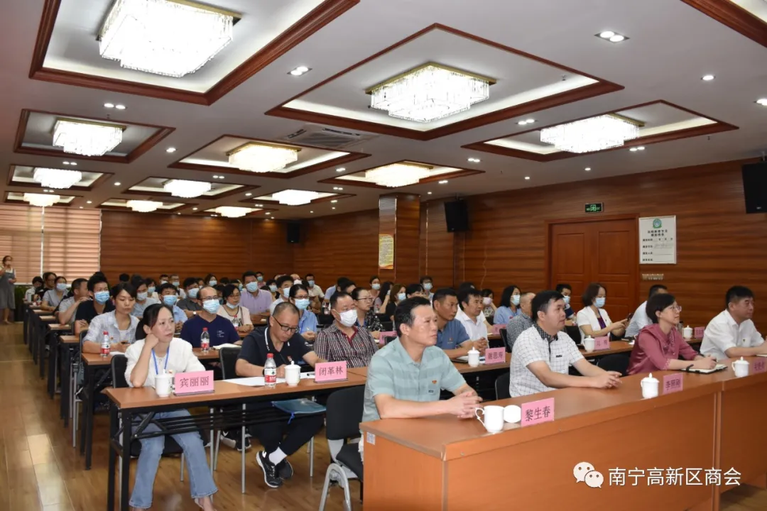南宁市委统战部副部长、市工商联党组书记李忠南,南宁市工商联经济部部长李照刚,高新区机关党委副书记、党工委办公室副主任关坚贞,南宁-东盟企业总部基地党委书记黎生春,高新区商会会长单位、广西田园生化股份有限公司党委专职副书记刘辉,高新区商会常务副会长单位及其他会员单位党员代表共76人现场聆听了党课。